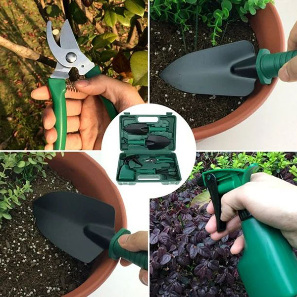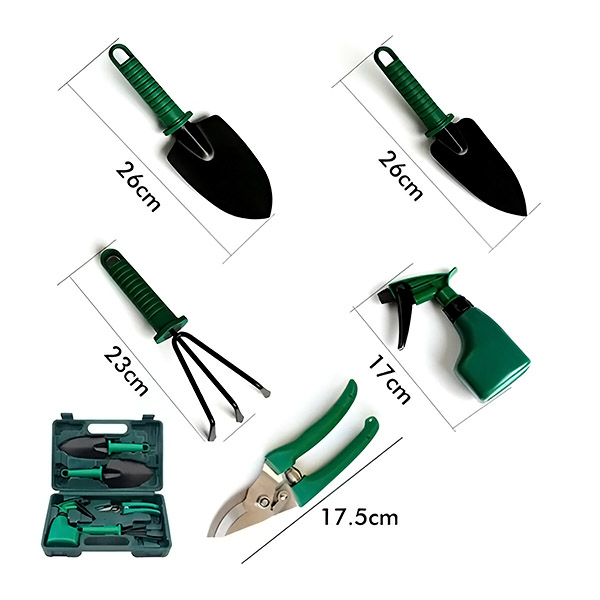 1 x Kerti szerszámkészlet tárolódobozzal: 1 x gyomlálókarom/ gereblye, 2 x ültetőkanál, 1 x metszőolló, 1 x porlasztó.