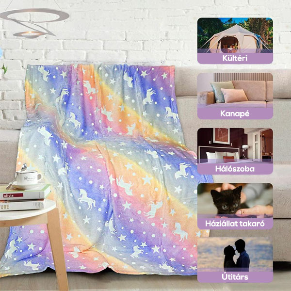 A kényelmes és meleg takaró fényt bocsát ki az éjszakai órákban! Választhat egyszarvú vagy dinoszaurusz mintát!