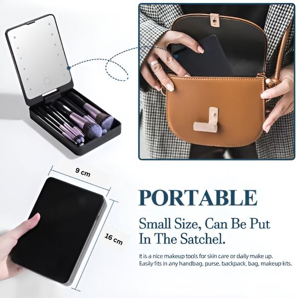Az ecsetkészlet és a LED-es tükör tökéletesen elfér a táskájában, így könnyen javíthatja a sminkjét, bárhová is viszi a nap.
