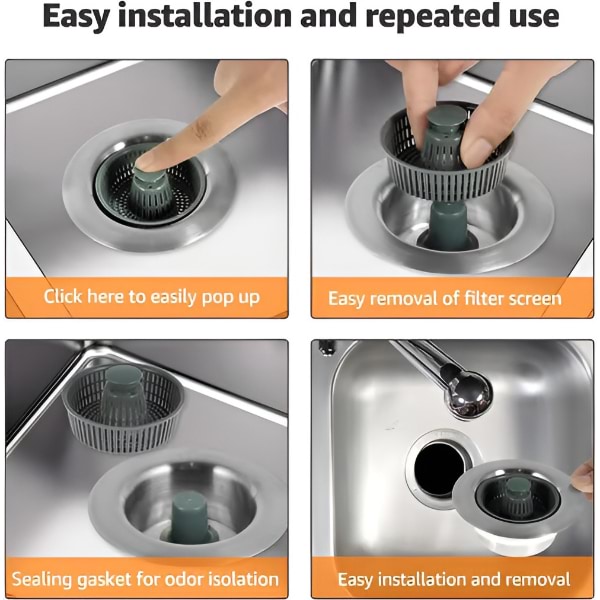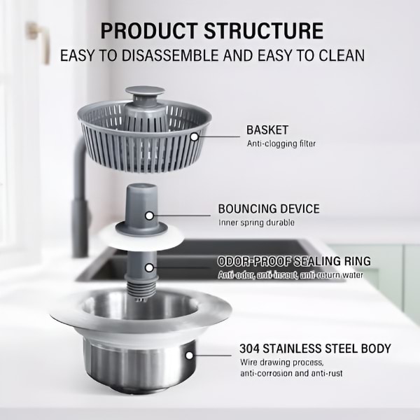 A kiváló minőségű rozsdamentes acélból és ABS-ből készült mosogató lefolyószűrő tartós, hőálló és rozsdamentes, így könnyen használható és karbantartható.