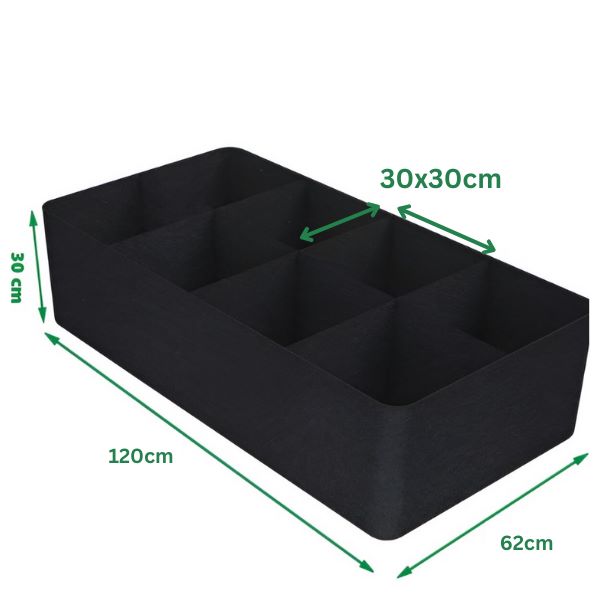 Ez a szövetből készült magasított kerti ágyás 8 ráccsal ellátott kialakítással rendelkezik, 120 x 62 cm-es méretekkel és 30 cm-es magassággal.